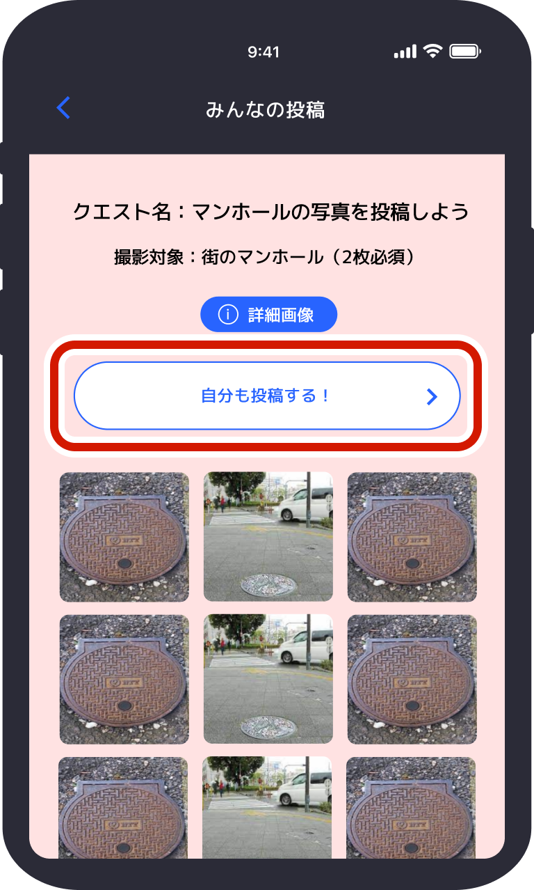 みんなの投稿画面の「詳細画像」ボタンを押下すると、該当クエストの詳細画像が見れます。投稿前に確認してみましょう。
