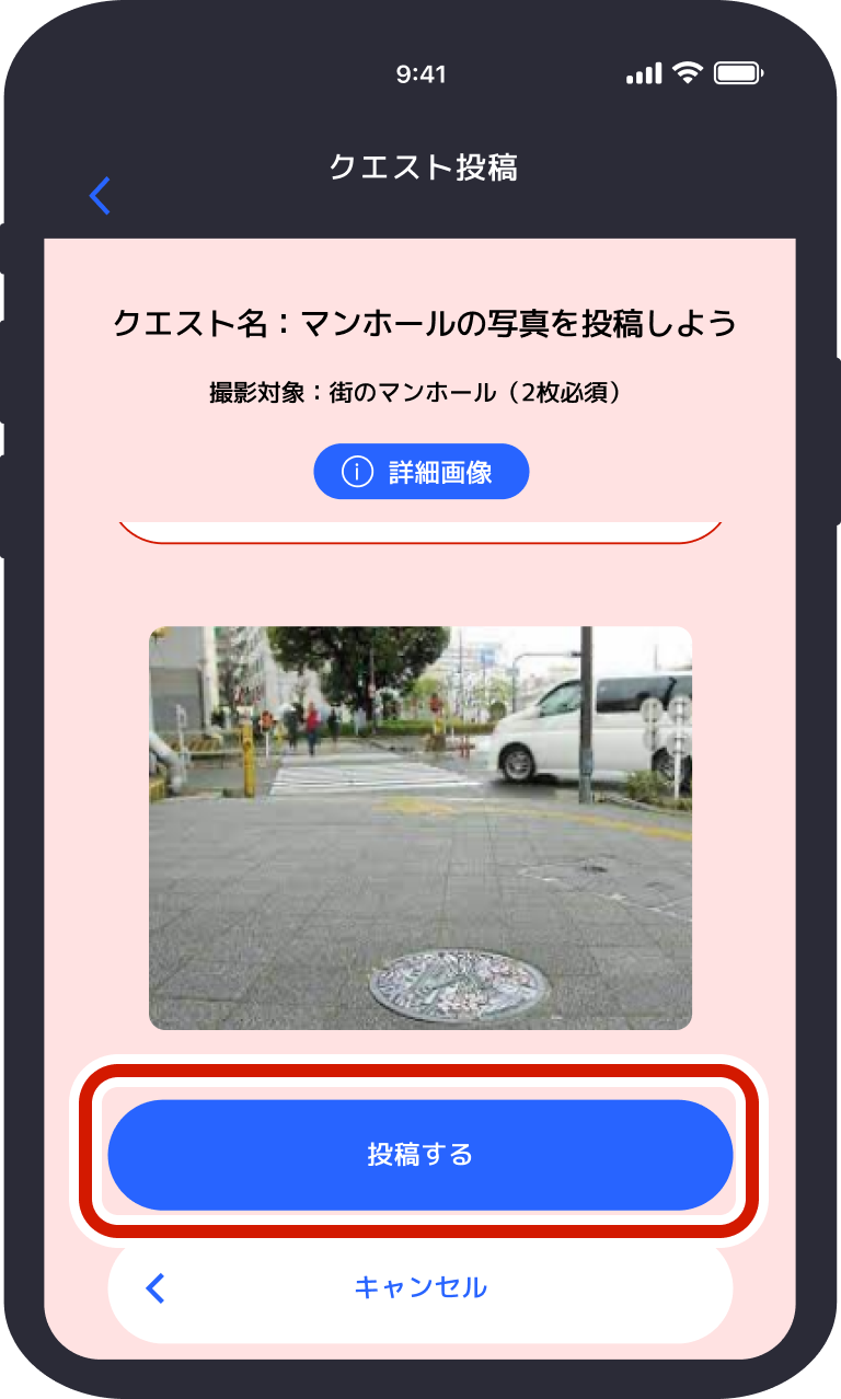 「投稿する」ボタンを押下することで、スポットクエストへの投稿ができます。